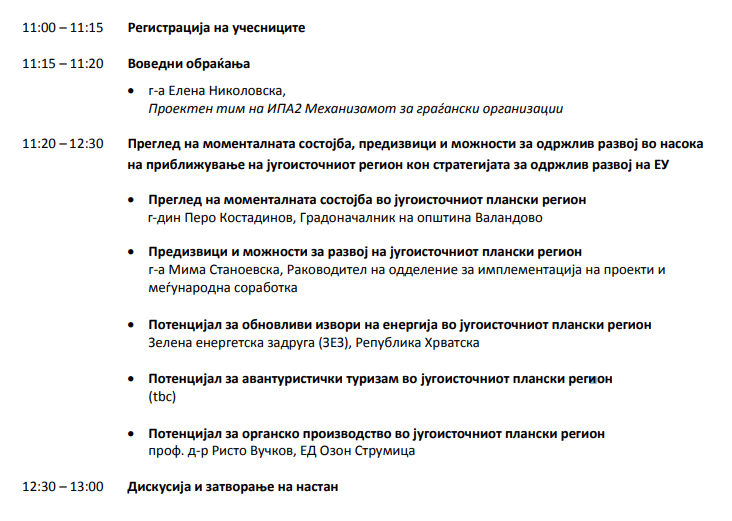 Настанот има за цел да иницира дискусија помеѓу сите засегнати страни за предизвиците и можностите за развој на југоисточниот плански регион во рамки на стратегијата за одржлив развој на ЕУ и агендата за одржлив развој 2030.