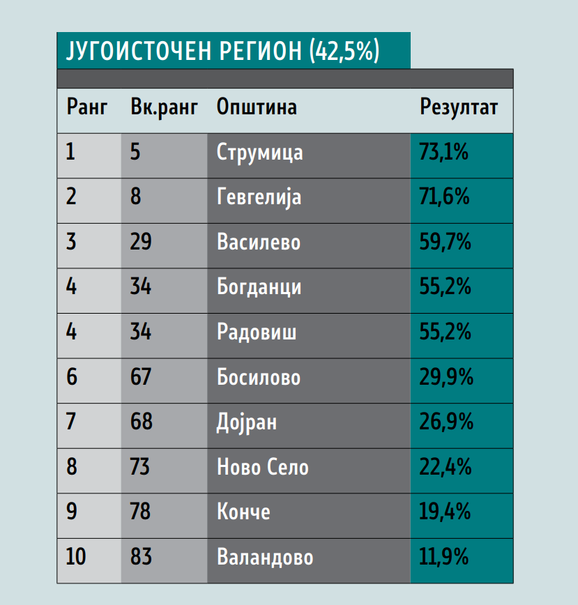 Овој пад придонесе Општина Валандово да биде последна во југоисточниот регион, со цели 7.5% позади претпоследната, Општина Конче. Во однос на прворангираната општина, Општина Струмица, заостануваме со 61.2 индексни проценти.
