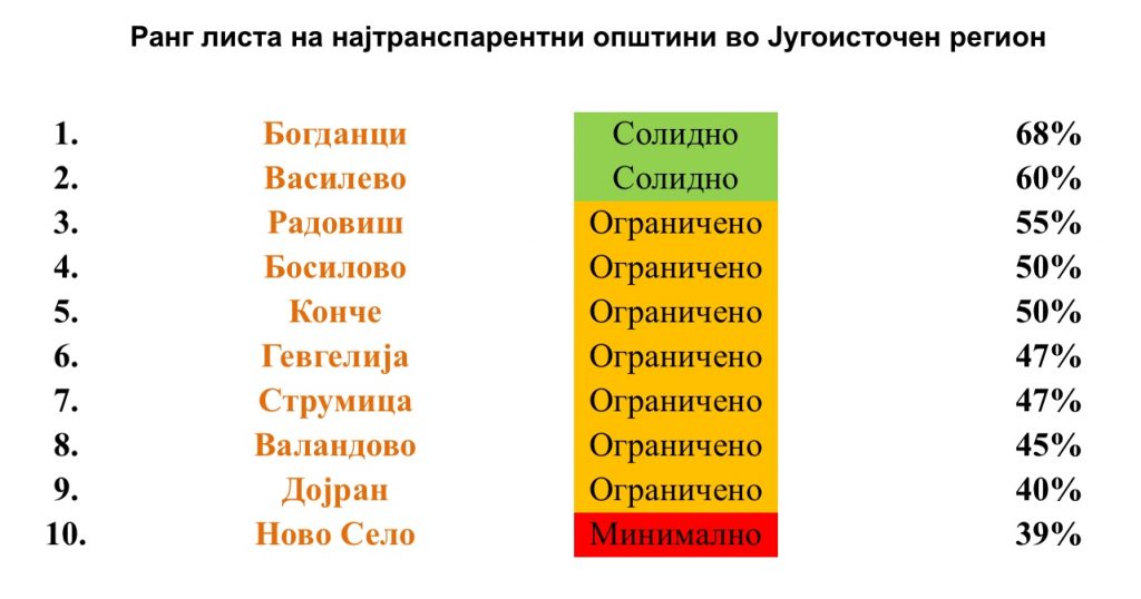 Потоа следуваат, општина Василево со 60% од максималните бодови што е всушност долната граница за солидна транспарентност. Општина Радовиш има 55% од максималните бодови, по 50% имаат општините Босилово и Конче, потоа следуваат Гевгелија и Струмица со по 47% од можните поени за транспарентност, па општината Валандово со 45%, Дојран со 40% и најслабо рангираната општина во овој регион, Ново Село со 39%.