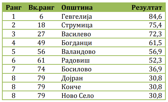 Како што се наведува во истражувањето годинава лидери во подобрувањето се четирите општини: Брвеница, Шуто Оризари, Желинои Валандово. Кај сите нив, процентот на исполнетост на обврските, само за една година, пораснал за повеќе од 40 процентни поени.