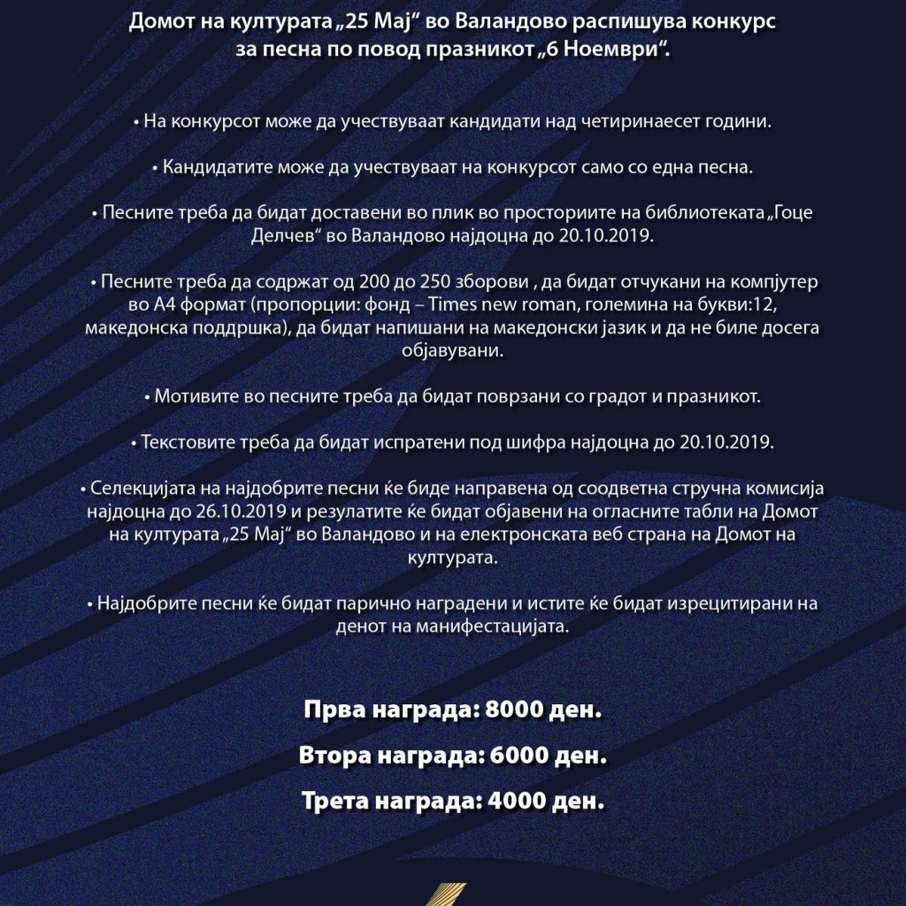 Домот на културата „25-ти Мај“ по повод празникот „6-ти Ноември“ распишува конкурс за песна.
